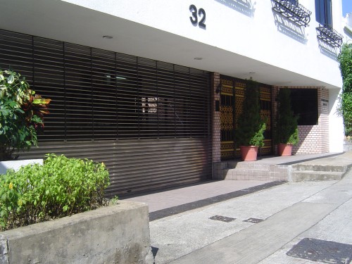 連接汽車路與旁行人斜路,旁是屋苑出入口閘門,通道是寬闊平坦無障礙的屋苑汽車出入口閘門,往來屋苑住宅,前臨下斜路緣,兩旁行人路無觸覺引路帶,閘門是金屬支捲閘門.