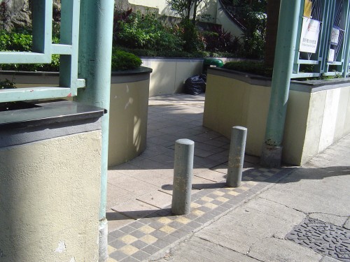 連接汽車路旁行人路,通道原是寬闊平坦的出入口,設有一排兩支灰色粗圓金屬柱,柱間闊約0.8米,無觸覺引路徑.
