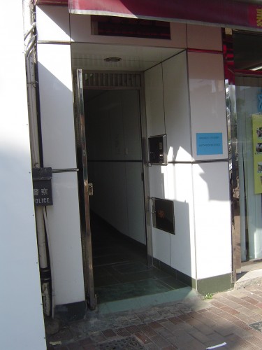 連接汽車路旁行人路,通道是較窄的住宅正門,前臨一級台階障礙,無斜道輔助,無觸覺引路徑,閘門是不銹鋼面單邊閘門,可輸入密碼開啟.