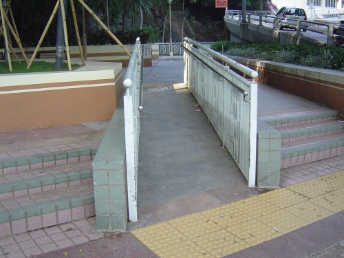 連接休憩處內行人通道與汽車路旁行人路高低位置,與斜道並排,共有三級踏板,頂端無警告帶,底端設有黃色觸覺警告帶,底端警告帶與毗連的斜道底端警告帶相連,兩邊無扶手及牆壁.