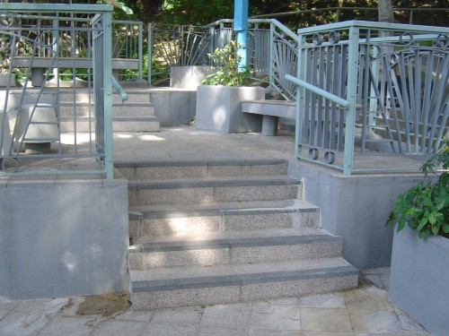 連接休憩處內行人通道高低位置,梯級有三級踏板,頂底兩端無觸範警告帶,兩邊無扶手及牆壁,單邊設有綠色欄杆.