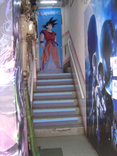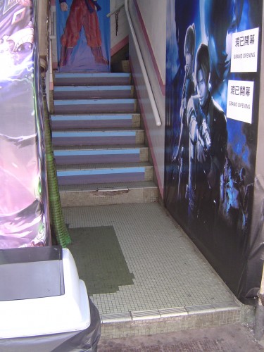 連接汽車路旁行人路,通道是夠闊的出入口,前臨一級台階障礙,連接夠闊的梯級走廊,無斜道輔助,無觸覺引路徑.