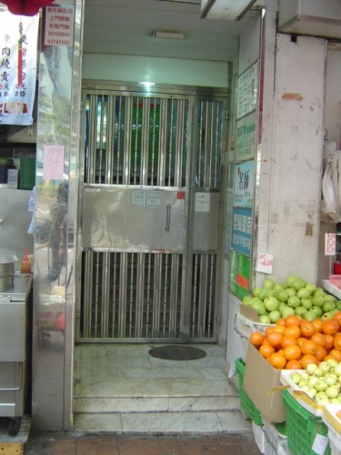 連接行人道,入口有一級梯級障礙,旁無斜道輔助,通道闊度比一扇門稍闊,無觸覺引路徑,門是不綉框單邊推門,門後是樓梯,踏板是雲石材料.