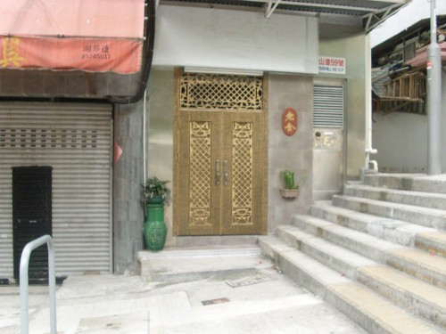 通道寬度不足,門檻下有一大級梯級,設有兩扇對開木門,門前的行人路因地勢很陡斜,左右都有梯級。