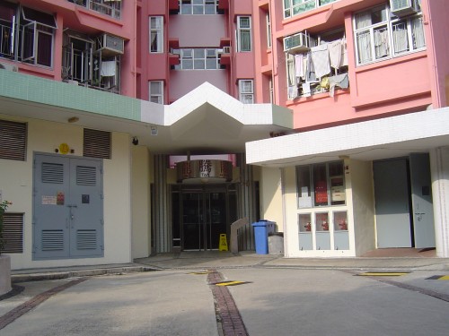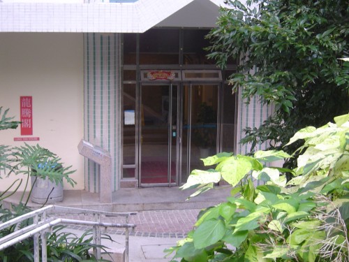 連接屋苑行人路,通道是寬闊的住宅出入口,設有一級台階障礙,無斜道輔助,兩旁行人路無觸覺引路徑,門是不綉鋼框玻璃對開推門,可輸入密碼開啟.