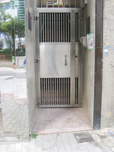 通道寬闊,離地先有1級,往內再有3級梯級,無扶手,無觸覺警告帶。梯級頂部設有一扇密碼鐵閘。
