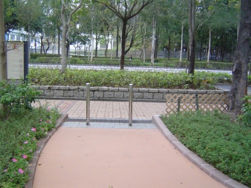 連接行人路,路面是暗斜路面,寬闊平坦,前臨六支金屬色圓柱障礙,圓柱間最闊處不足0.9米,無觸覺引路徑,行人路遊樂場段橫貫窄條水渠蓋.