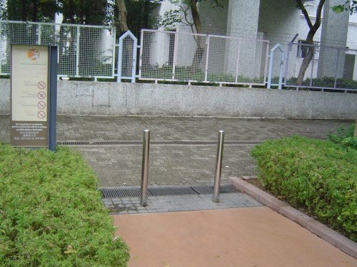 連接行人路,路面寬闊,前臨三支金屬色圓柱障礙,圓柱間最闊處只0.9米,無觸覺引路徑,圓柱前橫貫窄條水渠蓋.