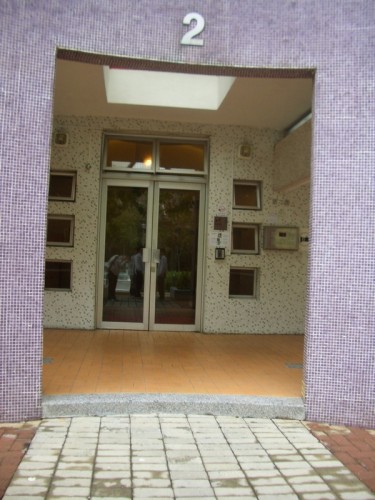 前臨建築物有蓋走廊,連接屋苑行人道,行人道是一級台階,正門前左右兩邊設有弧形斜道,寬闊無障礙,走廊牆壁設扶手,無觸覺引路徑.