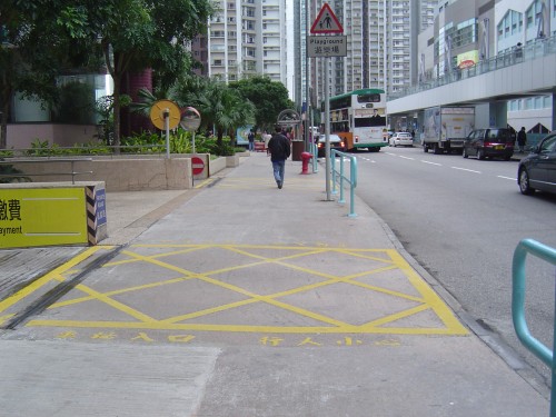 連接汽車路及旁行人路,通道是寬闊平坦無障礙的汽車路連接出口及入口,出口及入口分隔兩邊,中間是一段行人通道,出口及入口各前臨下斜路緣連接汽車路,兩旁行人路無觸覺引路徑.