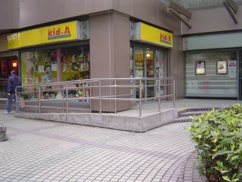 連接正門前平台行人路與汽車路旁行人路高低位置,斜道是直角轉向斜道,斜道夠闊,斜度不高,頂底兩端無觸覺警告帶,兩邊設有金屬扶手固定在兩邊同色欄杆上,扶手一邊是商舖玻璃幕牆,另一邊是行人路無牆壁.