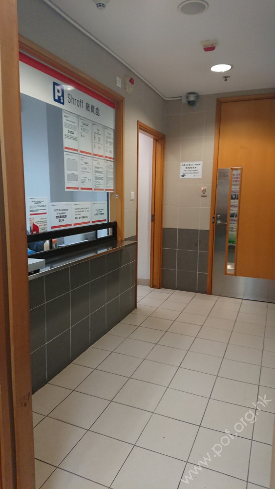 設有一扇拉向升降機大堂的防煙門,開門力度適中,門的淨闊度大於800毫米;門內左邊設有繳費處;沒有觸覺引路帶。