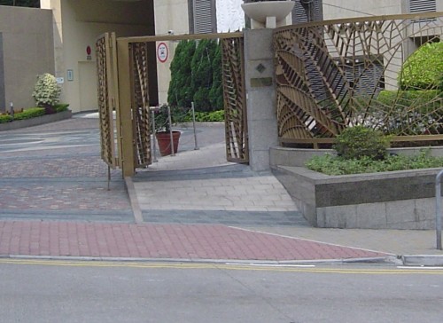 連接汽車斜路旁行人斜路,通道是寬闊平坦無障礙的屋苑出入口閘門,毗連屋苑汽車出入口大閘門,往來屋苑住宅各座,閘門前設有一段暗斜面,連接屋苑汽車出入口前下斜路緣,無觸覺引路徑,閘門是香檳色金屬框對開閘門.