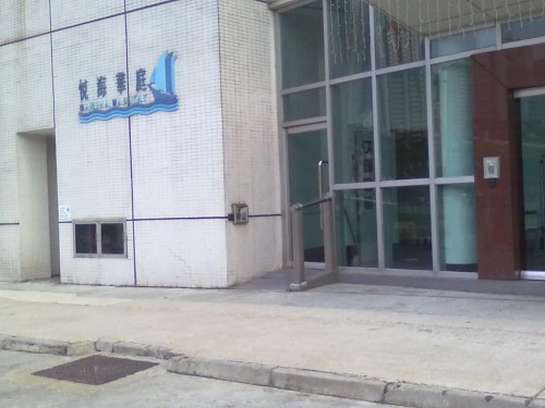 連接出入口與汽車路旁行人路高低位置,斜道是一扇門闊度,比較狹窄,頂端緊貼出入口玻璃門無平面空間,頂底兩端無觸覺警告帶,單邊設有欄杆旁無牆壁,另一邊是屋苑白色外牆,牆上有方形凸出物,踏板深灰色.