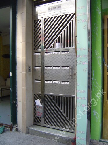 連接汽車路旁行人路,通道是不太寬闊的住宅正門閘門,設有一級台階障礙,無斜道輔助,無觸覺引路徑,閘門是不銹鋼面單邊閘門.