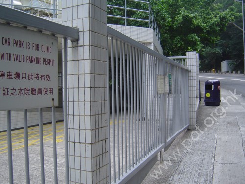 連接汽車路旁行人路,通道是寬闊平坦無障礙的閘門,往來診所建築物,無觸覺引路徑,閘門是灰色金屬框架對開閘門.