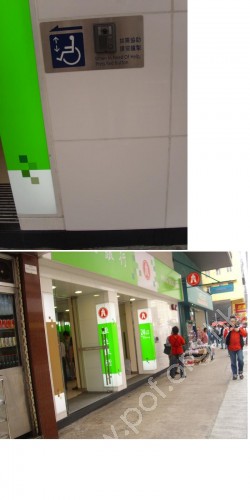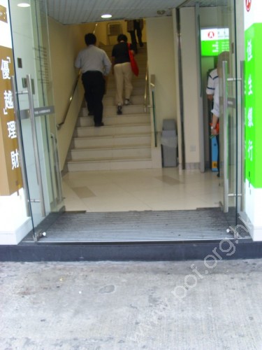 通道有兩條,都有一級梯級障礙,分別設有一扇和兩扇對開的手推玻璃門。無扶手及觸覺警告帶。該行地下僅設櫃員機,營業廳位於一樓。入口門邊設有暢通易達標誌和求助鐘。