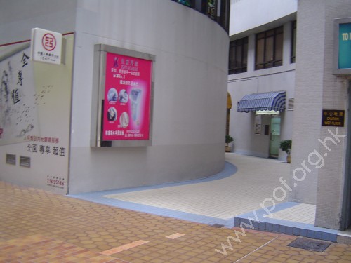 連接往來與市政大廈之間行人路,通道是一端寬闊平坦無障礙的屋苑出入口,連接往來住宅的寬闊平坦行人通道,無觸覺引路徑.