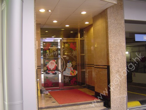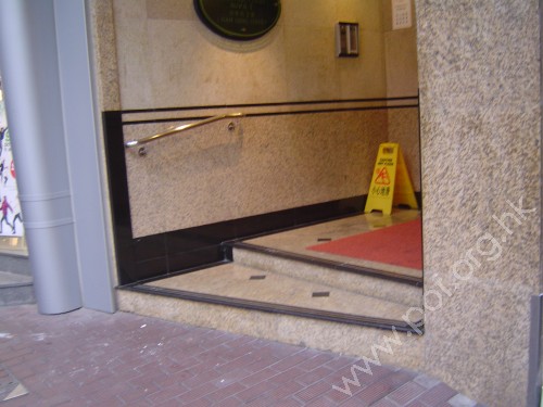 連接汽車路旁行人路,通道是寬闊的住宅正門,連接一條寬闊的走廊通道,通道前臨兩級梯級障礙,無斜道輔助,無觸覺引路徑,門是不綉鋼框玻璃對開推門,可輸入密碼開啟.