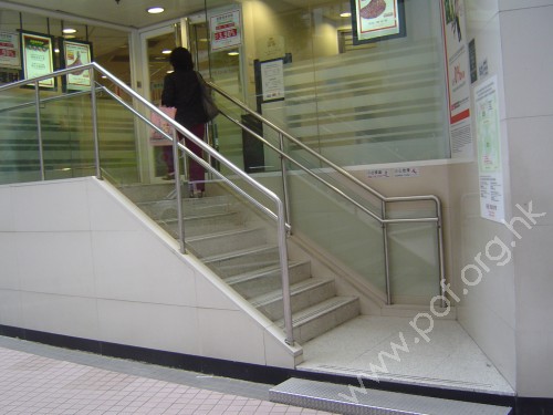 連接汽車路旁行人路,通道是寬闊的出入口,前臨兩級梯級障礙,無斜道輔助,無觸覺引路徑,門是玻璃對開推門.