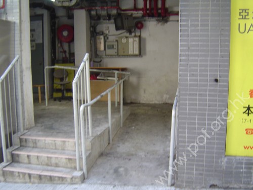 連接汽車路旁行人路,通道是夠闊的建築物通道,是斜道與梯級並排,無觸覺引路徑,通道進入後是往來建築物的升降機通道.