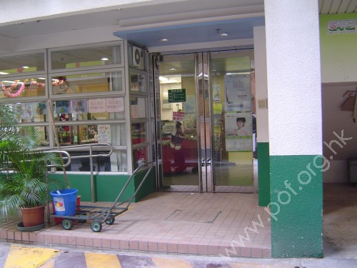 連接與協勝大廈之間行人路,通道是闊度無障礙的正門,前臨一級高出行人路的台階,旁設斜道輔助,無觸覺引路徑,門是不綉鋼框玻璃對開推門.