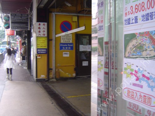 連接汽車路與旁行人路,通道是寬闊平坦無障礙的屋苑汽車出入口,前臨下斜路緣,兩旁行人路無觸覺引路徑.