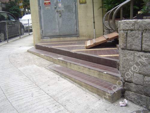 連接汽車路旁行人路,通道是寬闊的住宅出入口,往來住宅各座正門,前臨兩層梯級障礙,無斜道輔助,無觸覺引路徑.