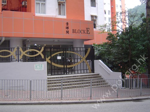 連接汽車斜路旁行人斜路,通道是寬闊的屋苑出入口閘門,往來住宅樓宇,前臨梯級障礙,無斜道輔助,無觸覺引路徑,閘門是黑色金屬框架對開大閘門.