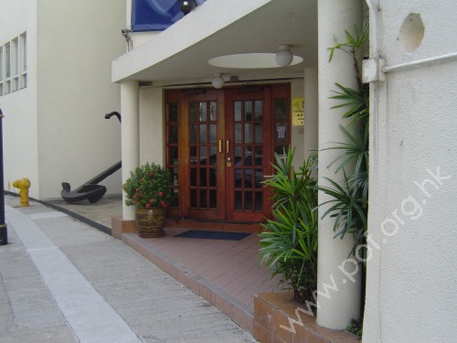 連接汽車路旁行人路,通道是寬闊的建築物正門,前臨一級台階障礙,無斜道輔助,無觸覺引路徑,門是棕色木框格子玻璃對開推門.