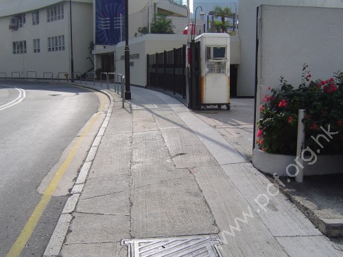 連接汽車路與旁行人路,通道是寬闊平坦無障礙的汽車出入口閘門,往來會所範圍,前臨下斜路緣連接汽車路,兩旁行人路無觸覺引路徑.