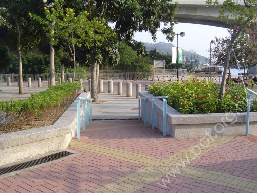 連接往來觀海徑與海濱花園行人路的出入口進入後空間,與花園內較高平台行人路高低位置,斜道寬闊,斜度較高,頂底兩端無觸覺警告帶,兩邊設有欄杆形扶手固定在踏板上,兩邊欄杆旁是花槽矮壆無牆壁.