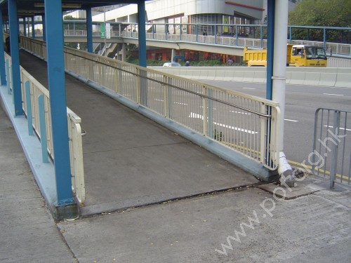 連接地面汽車路旁行人路,通道是寬闊無障礙的有蓋斜道通道,斜道頂端與梯級頂端連接,連接行人天橋橫過汽車路,無觸覺引路徑.