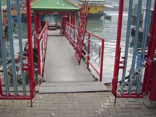 連接花園空地行人路,通道是寬闊無障礙的出入口閘門,連接往來碼頭躉船的渡橋行人通道,渡橋兩旁設有紅色淺藍色欄杆,無觸覺引路徑,閘門是紅色淺藍色金屬對開閘門.