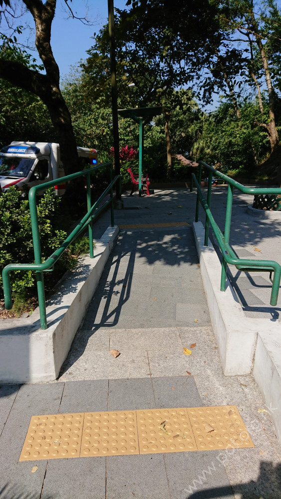 闊度大於1.05米,入口前設有一個不合規格的下斜路緣,連接旭龢道行車道和入口處,兩邊是旭龢道行人路、矮牆和園圃;入口內左邊往上設有一段斜道,斜度不超過1:12,兩側設有扶手和金屬圍欄;沒有觸覺引路帶。