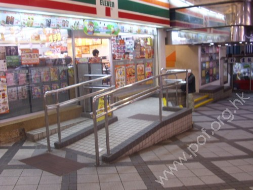 通道寬闊,門前設有3級踏板的梯級和一條長斜道,無觸覺警告帶和觸覺引路帶。