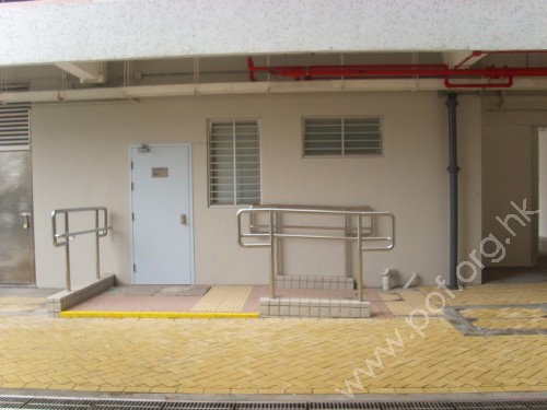 通道闊度大於1.05米,門前有一級梯級,旁設有斜道,無觸覺引路帶。入口是一扇淺藍色木門。