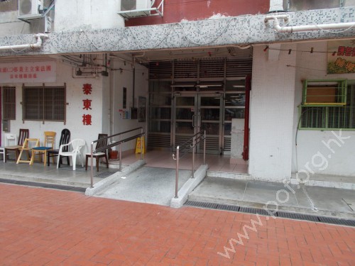 連接屋邨空地及行人路,前設一段斜道,斜度不高,兩邊有扶手,無觸覺引路帶,門是不綉框手推玻璃門,需輸入密碼開啟。