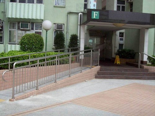 斜道不長只有一段,斜度不高,兩邊有扶手,底頂兩端有平面,並有黃色觸覺警告帶。