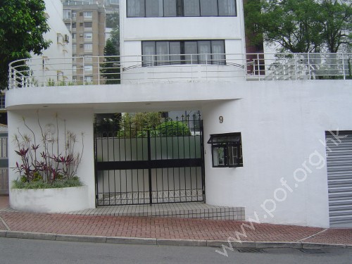連接汽車斜路旁行人斜路,通道是寬闊的屋苑出入口閘門,往來屋苑住宅,前臨一級台階障礙,無斜道輔助,無觸覺引路徑,閘門是黑色金屬框玻璃對開閘門.