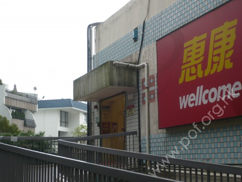 連接汽車路旁行人路,通道原是寬闊的出入口,連接往來超級市場出入口的長斜道,出入口連接行人路是一邊高一邊低,與行人路不平成障礙,無斜道輔助,同時設有三支灰色金屬圓柱使出入口變得狹窄,無觸覺引路徑.