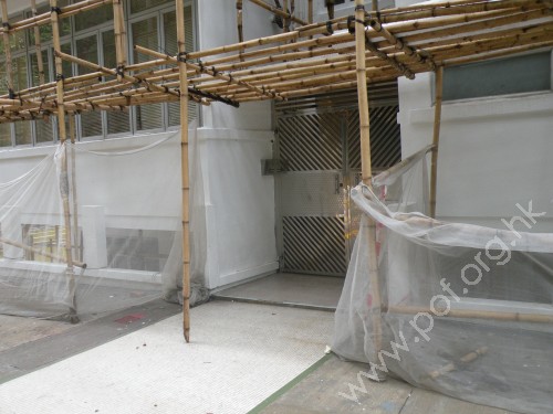 連接汽車路,通道是寬闊的住宅出入口閘門,前臨一級很低的台階障礙,無斜道輔助,無觸覺引路徑,閘門是不銹鋼框對開閘門.