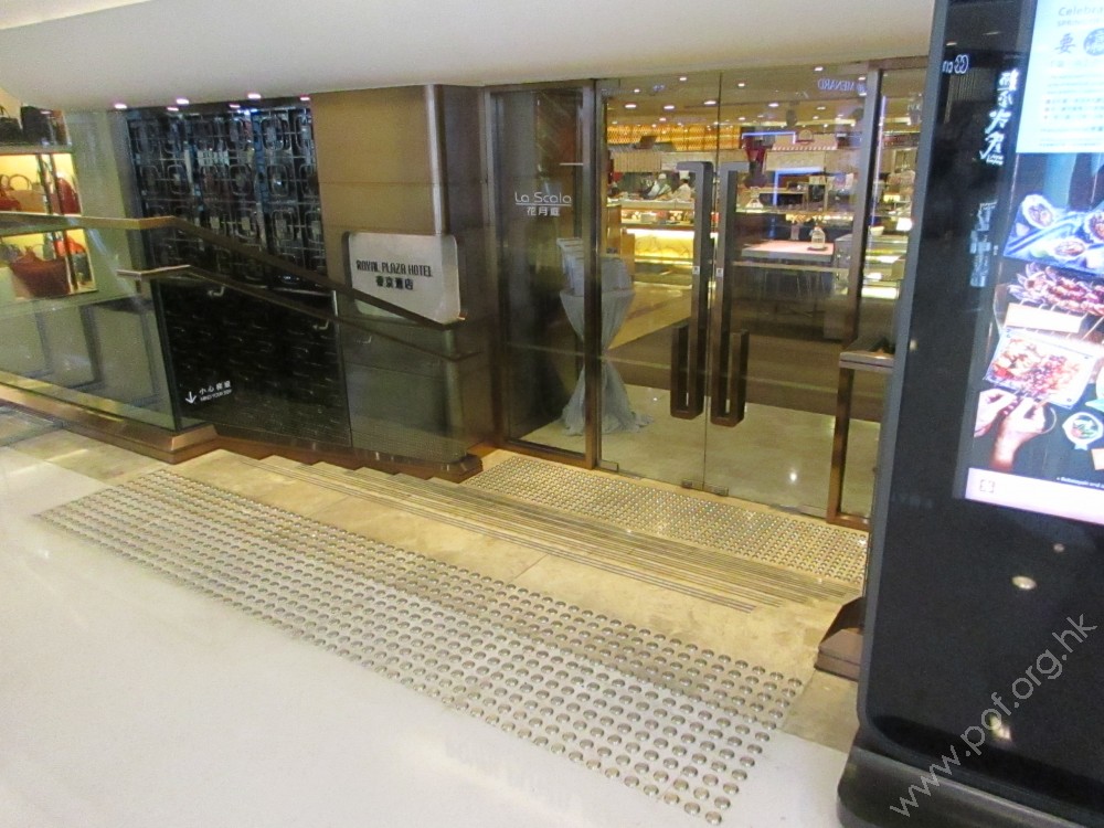 通道寬闊,出入口前有一級低矮的梯級阻礙,出入口處設有三組兩扇對開的玻璃推拉門,無觸覺引路帶。