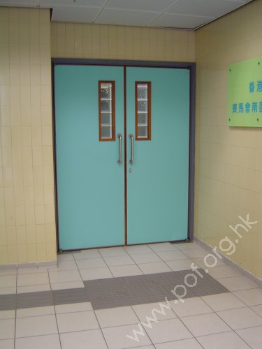 連接社區中心3層行人通道,通道是寬闊平坦無障礙的單位正門,前設有黑色觸覺引路徑,連接3樓1號升降機門,門是淺藍色對開木門.