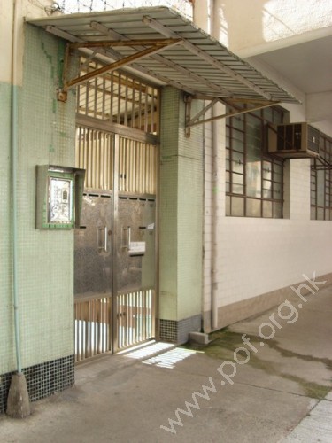 通道寬闊,入口前有一小級梯級,設有兩扇不銹鋼密碼閘,旁邊有對講機按鈕,閘內是梯級,無觸覺引路帶。