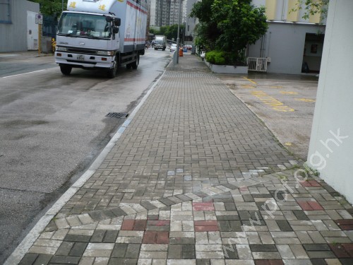 設施連接汽車路與旁邊行人路,位於汽車出入口閘門與汽車路之間,面積寬闊,斜度低,斜面無觸覺警告帶,有行人路保留面積,視野開揚。