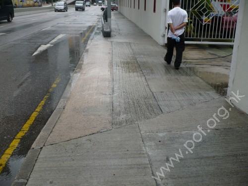 設施連接汽車路與旁邊行人路,位於汽車出入口摺閘門前車路與公共汽車路之間,面積寬闊,斜度低,斜面無觸覺警告帶,頂端是摺閘門前汽車路,權充行人路保留面積,視野開揚。