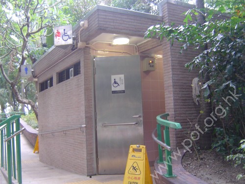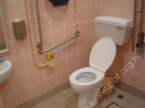 廁格是無分性別,門頂上設有深藍色國際暢通易達標誌,標示供障殘人士使用,無觸覺或凸字資料,門內外設有扶手,座廁高0.5米,沖水掣高1米,設有L扶手及摺合扶手,摺合扶手旁設有圖解說明使用方法,緊急叫喚鐘顯示器位於門外頂,按鈕位於L扶手下,高0.68米,旁文字告示已脫色.