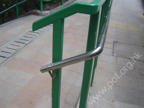是金屬色圓條形,兩邊固定在綠色欄杆上,頂底兩端無平行地面伸延設計,有觸覺點字及凸字資料.