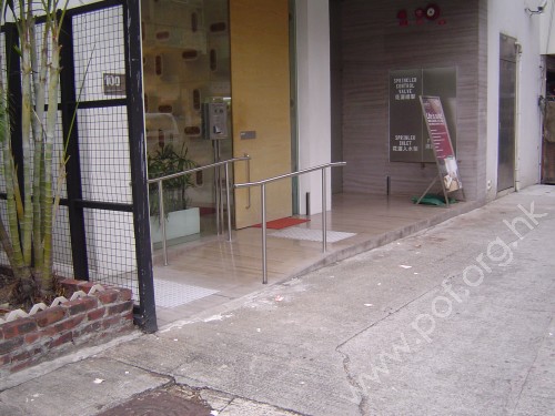 連接住宅正門與汽車路旁行人路高低位置,斜道寬闊,斜度低矮,頂底兩端設有灰色觸覺警告帶,兩邊設有欄杆形扶手固定在踏板,一邊扶手旁無牆壁,另一邊與住宅外牆玻璃幕牆有距離.